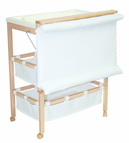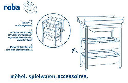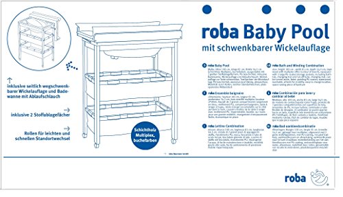 Deze praktische badwikkelcombinatie is gemaakt van natuurlijk hout in aantrekkelijk beuken decor. Met één handgreep kan hij van de commode in een wasmogelijkheid worden veranderd. Het met textiel beklede aankleedkussen is gecoat met veilig PU (polyurethaan) en daardoor huidvriendelijk, afwasbaar en onderhoudsvriendelijk. Het aankleedoppervlak kan indien nodig zijwaarts worden weggedraaid, want onder bevindt zich het badstation met geïntegreerde badkuip. De afvoerslang van de badkuip maakt het op eenvoudige wijze mogelijk om het badwater af te voeren zonder de kuip te verplaatsen. Daarnaast heeft deze badwikkelcombinatie twee stoffen opbergvakken om alle benodigde spullen op te bergen. De houten basis is oprolbaar om een eenvoudige plaatswisseling mogelijk te maken. De Roba babyzwembaden zijn dagelijkse metgezel voor moeder en kind. De geïntegreerde badkuip, het afwasbare aankleedkussen en vele grote planken maken de badwikkelcombinatie tot een praktische onmisbare allrounder. Kenmerken: – natuurlijk hout – met wielen voor eenvoudige verplaatsing – incl. zacht gevoerde aankleedkussen van onderhoudsvriendelijk canvasmateriaal, PU-gecoat dus afwasbaar, afneembaar – met praktische planken van stof – incl. badkuip met afvoerslang; Roba babyzwembad, opklapbaar: met wielen, H x B x D: 99 x 46,5 x 78 cm, aankleedhoogte: 94 cm, met 2 stoffen legplanken, bruikbaar tot 15 Kg , aankleedoppervlak B x D: 43 x 78 cm
