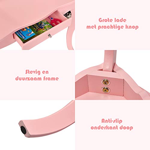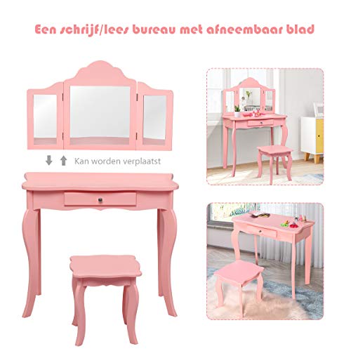 Specification: COSTWAY Kinderen kaptafel, prinses make-up tafel met kruk en inklapbare spiegel, make up tafel voor kleine meisjes (Roze…